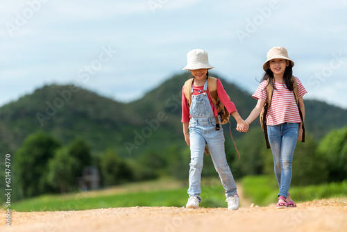 Group friend children travel nature summer trips. Family Asia people tourism walking on road happy and fun explore adventure outdoors for leisure and destination, mountain background