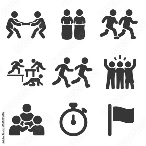 Group Games Icon Set. Solid, filled icons set of group games and fun activities: tug of war, sack race,