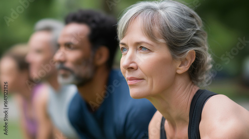 Group of Active Adults Practicing Plank Exercise in a Park