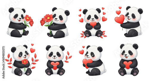Group of adorable panda bears holding flowers and hearts isolated on transparent background