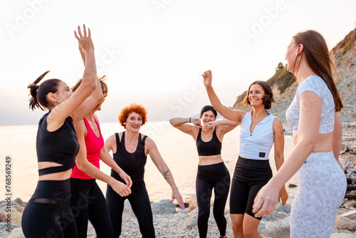 Group of adult athletic multiethnic women in sportswear happily jumps at coast in background of sunset and sea. Concept of wellness and female friendship