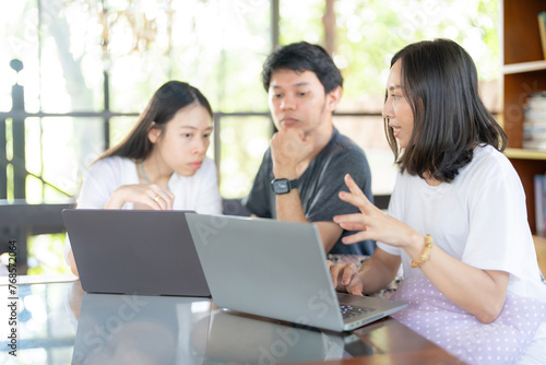 Group of Asian male and female students studying online in university faculty about subject with laptops in library Wear casual clothes and talk diligently with each other.