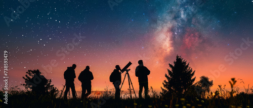 Group of astronomers with telescopes exploring the night sky at twilight. Astronomy and stargazing concept. Design for poster, wallpaper, and educational material.