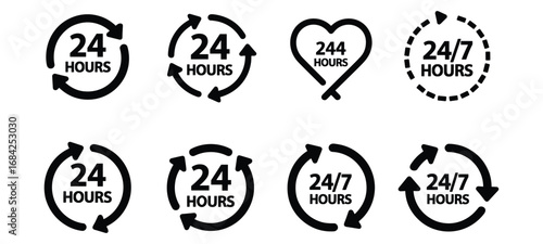 Group of black circular and heart shaped 24 hour service icons with arrows 24 hours 24/7