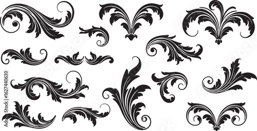 Group of Black Ornamental Flourishes and Swirls on White Background scroll ornate