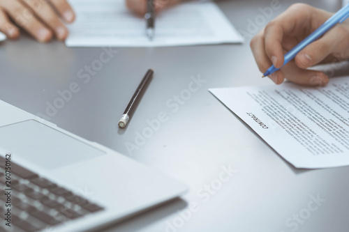 Group of business people and lawyer discussing contract papers sitting at the table, closeup. Businessman is signing document after agreement done