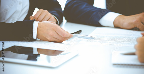 Group of business people and lawyers discussing contract papers sitting at the table, close-up. Successful teamwork, cooperation and agreement concepts
