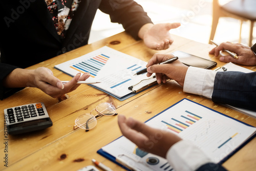 Group of business people discussing with analyzing data financial report at the office desk on montly meeting. Accounting concept.