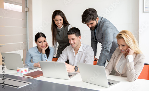 Group of business people gathered around young manager working on laptop developing strategy