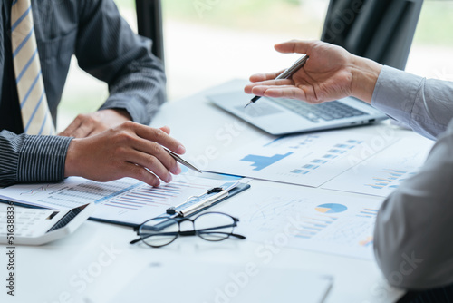 Group of business people meeting, discussing, analyzing graphs, financial data, and planning a marketing project together
