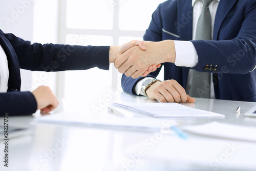 Group of business people or lawyers shaking hands finishing up a meeting , close-up. Success at negotiation and handshake concepts