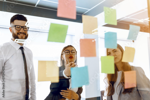 Group of business people united at whiteboard during strategic session in bright modern office