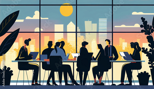 Group of business people working in office late hours, collaborating on a project, sharing ideas. AI generative illustration, vector flat design style