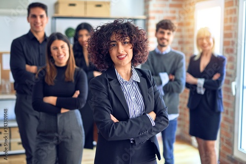 Group of business workers smiling happy and confident. Posing together with smile on face looking at the camera, young beautiful woman with crossed arms at the office