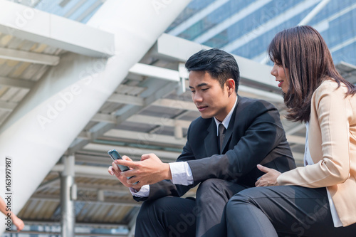 Group of businessman using the smartphone for business connection with her partner and sit in downtown with building background