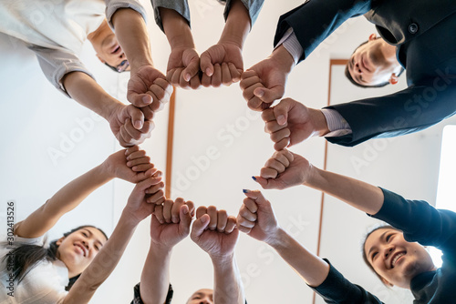 Group of businessmen join hands after completing their targeted tasks.