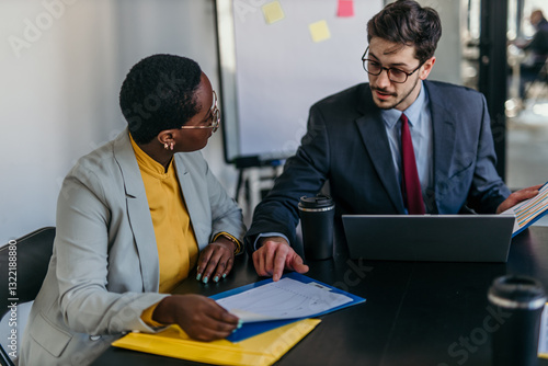 Group of businesspeople in formal attire discussing financial reports