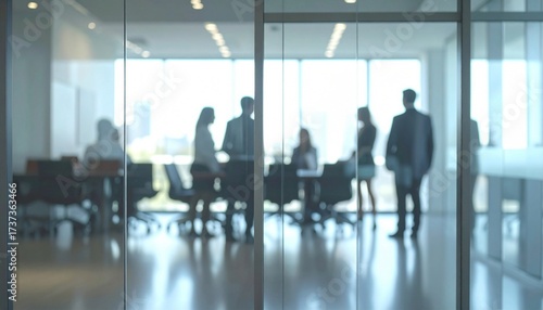 Group of businesspeople negotiating gathered in modern conference room, blurred silhouettes view, closed glass doors.
