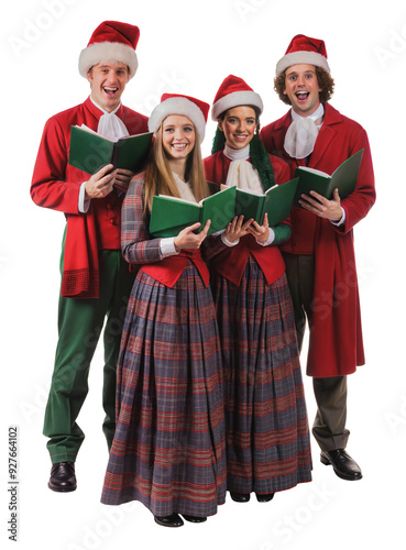 Group of carolers in festive attire at Christmas, cut out - stock png.