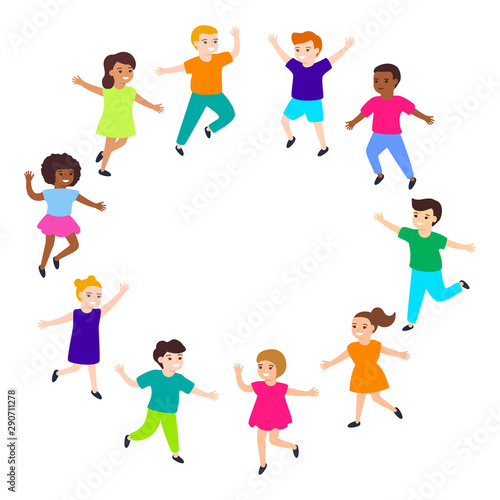 Group of cartoon happy multicultural children in circle, girl and boy playing. Cute diverse kids. Vector illustration