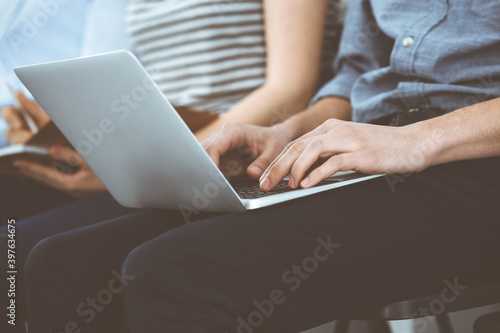 Group of casual dressed business people working at meeting or conference, close-up of hands. Businessman using laptop computer. Teamwork or coaching concept