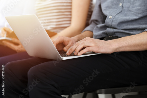 Group of casual dressed business people working at meeting or conference in sunny office, close-up of hands. Businessman using laptop computer