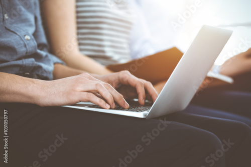 Group of casual dressed business people working at meeting or conference in sunny office, close-up of hands. Businessman using tablet computer