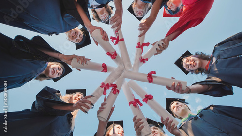 Group of cheerful graduates forming a circle, holding their diplomas together with pink ribbons, seen from a low angle