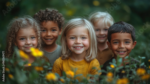 Group of cheerful little children of different nationalities in green summer park, friends, diversity, smiling child, kid, kindergarten, family, portrait, boys and girls faces