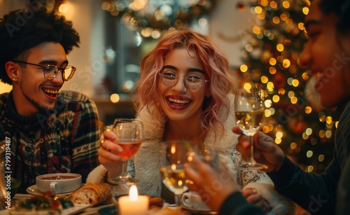 group of cheerful people at dinner, eating, toasting and enjoying the time they are spending together.