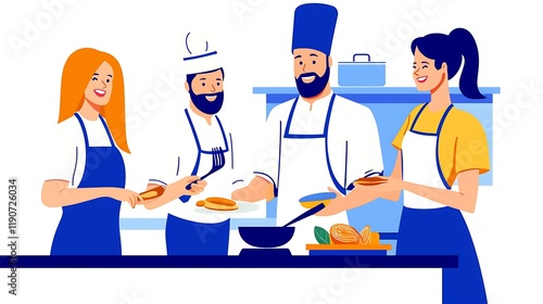 Group of chefs and friends preparing and serving pancakes in a bright kitchen setting