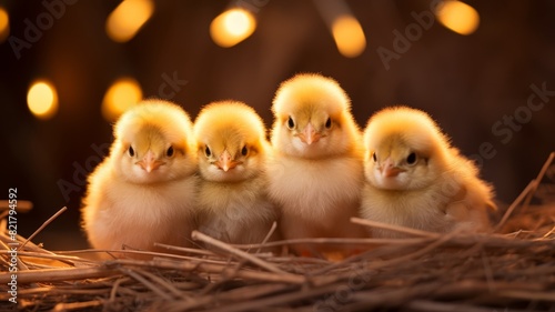 Group of chicks huddling together in a straw-filled nest, cozy barn light, copy space,
