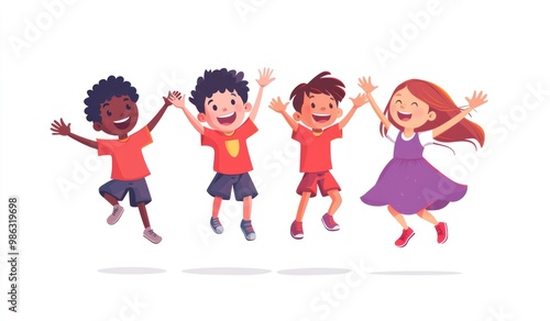 Group of children jumping and laughing together on a white background. Simple style illustration. Cute and dreamy colorful cartoon characters with happy expressions. Vector file has clean lines