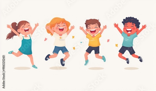 Group of children jumping and laughing together on a white background. Simple style illustration. Cute and dreamy colorful cartoon characters with happy expressions. Vector file has clean lines