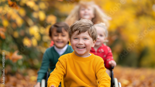 Group of children with varying disabilities playing together in an autumn park, vibrant leaves, and joyful atmosphere