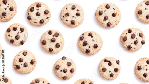 group of chocolate chip cookies isolated white. top view