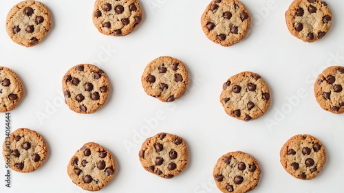 group of chocolate chip cookies isolated white. top view