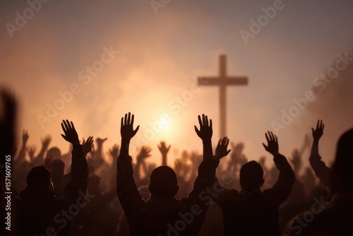 Group of Christians worshipping with raised hands at a spiritual gathering during sunset near a prominent cross in an outdoor setting