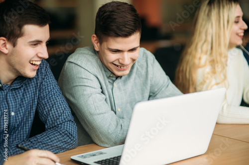 Group of college students studying in the school library, a girl and a boy are using a laptop and connecting to internet