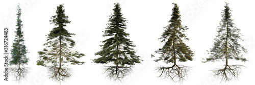 group of conifer trees with roots isolated on white background