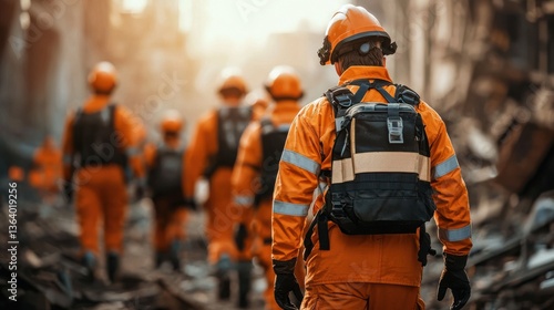 Group of Construction Workers Wearing Orange Protective Uniforms and Hard Hats Standing Together at an Outdoor Building Site Representing the Construction Industry Engineering