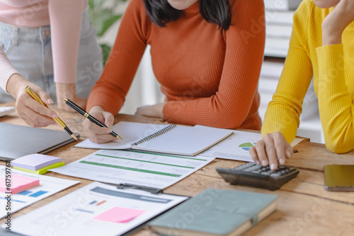 Group of creative meeting, hands of business marketing design and planning project on desk in office.