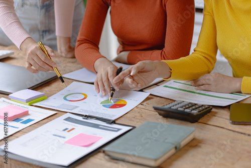 Group of creative meeting, hands of business marketing design and planning project on desk in office.