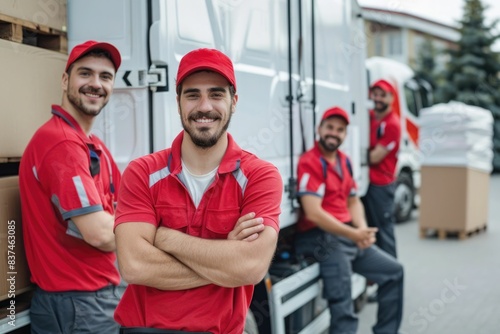 Group of delivery staff with transport truck. home delivery. Logistics worker.