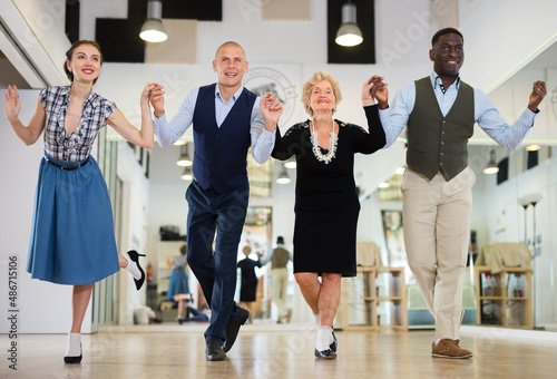 Group of different age dancers preparing swing performance
