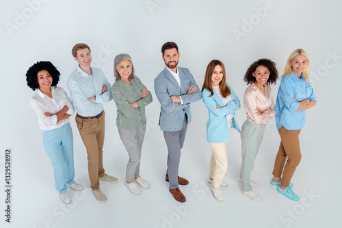 Group of diverse and professional individuals standing together on a grey background, showcasing teamwork and collaboration, top view