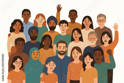Group of diverse people standing together. Multicultural and multiethnic community concept. Happy men, women and seniors from different cultures. Unity, social diversity, and inclusion.