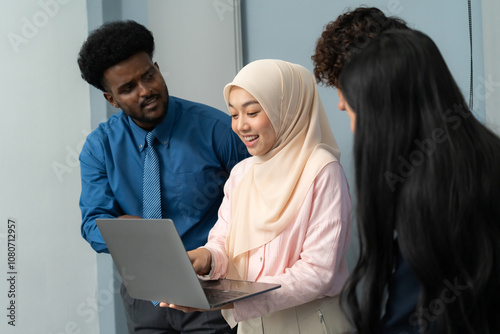 Group of diverse professionals gathered around a laptop, sharing ideas and collaborating on a project in a modern workplace.
