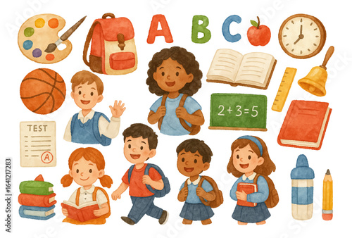 Group of Diverse School Children with Educational Elements in Watercolor Style, Isolated on White Background