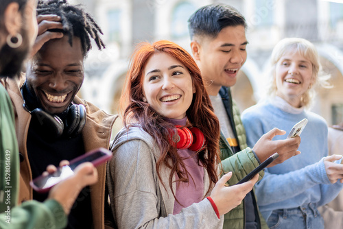 Group of diverse young friends smiling and interacting with smartphones in spontaneous urban moment